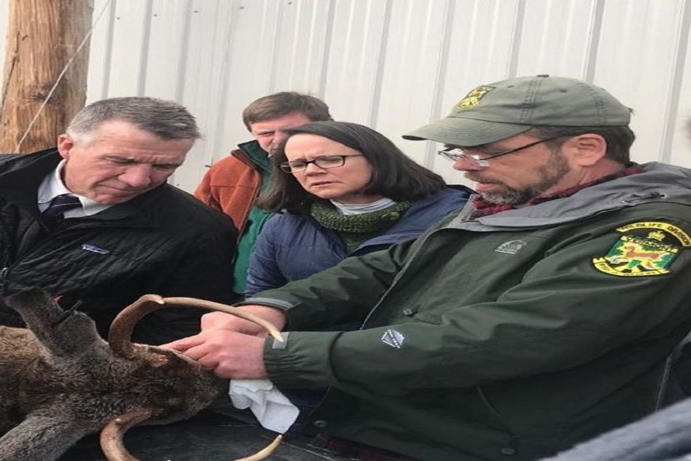 Image: John showing Governor Scott, Secretary Moore, and then-Commissioner Porter how to age deer by looking at their teeth at a hunter check station.